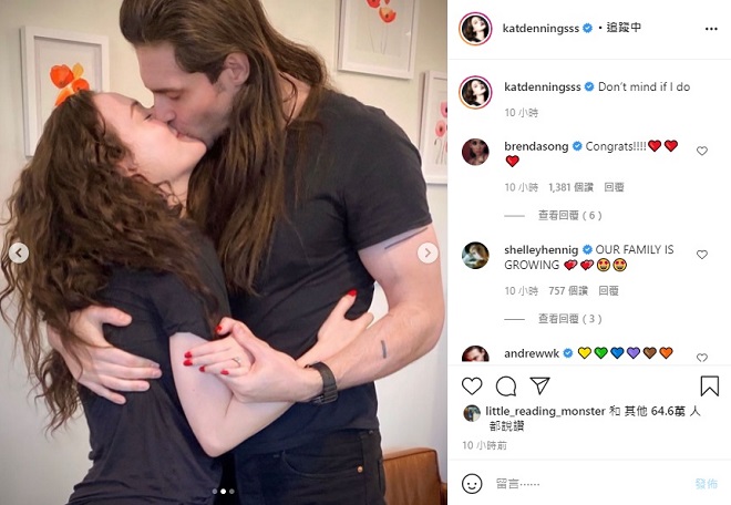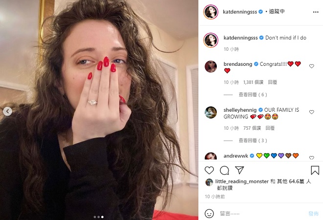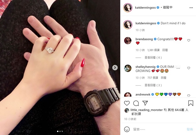 她在 Instagram 貼文中發布三張照片,首先是曬出戴著婚戒的模樣,接著可以看到兩人幸福擁吻的畫面,最後則是她秀出婚戒的獨照。