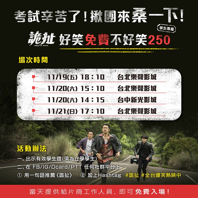 而日前《詭扯》所舉辦的特別搶先場活動「好笑免費不好笑250」,獲得廣大的迴響,有趣的是,更有人特別投錢支持,「為了鼓勵片商發行好片」;但也有學生族群反應,因卡到學校考試,無法前來參加,因此《詭扯》決定再加開學生限定「好笑免費不好笑 250」特別活動場,邀請剛結束考試的學生們看《詭扯》大笑放鬆,一解考試的緊張感,高中以上的學生只要憑在FB / IG / Dcard / PTT 任何社群平台上用一句話推薦《詭扯》,並加上 Hashtag「#詭扯好笑到不用帶錢包 #詭扯現正熱映中」,當天出示「學生證」以及「留言」給影城人員,即可免費進場!